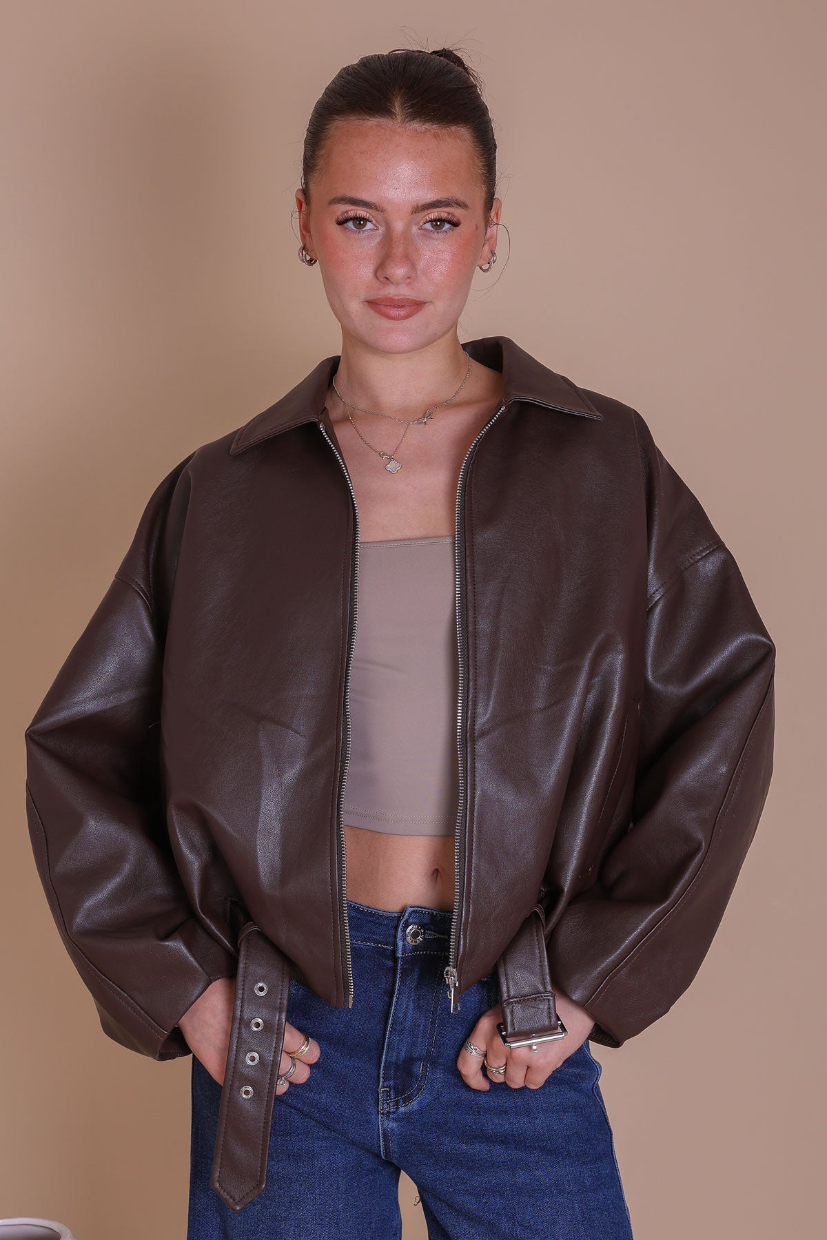 Make a statement with this trendy brown faux leather bomber jacket. Featuring a sleek, cropped silhouette, this jacket has a full-zip front, a wide collar, and an adjustable buckle belt at the hem to cinch the waist. The rich brown finish and relaxed fit make it the perfect piece to add an edge to any outfit, whether you're layering it over a dress or pairing it with your favourite jeans.
