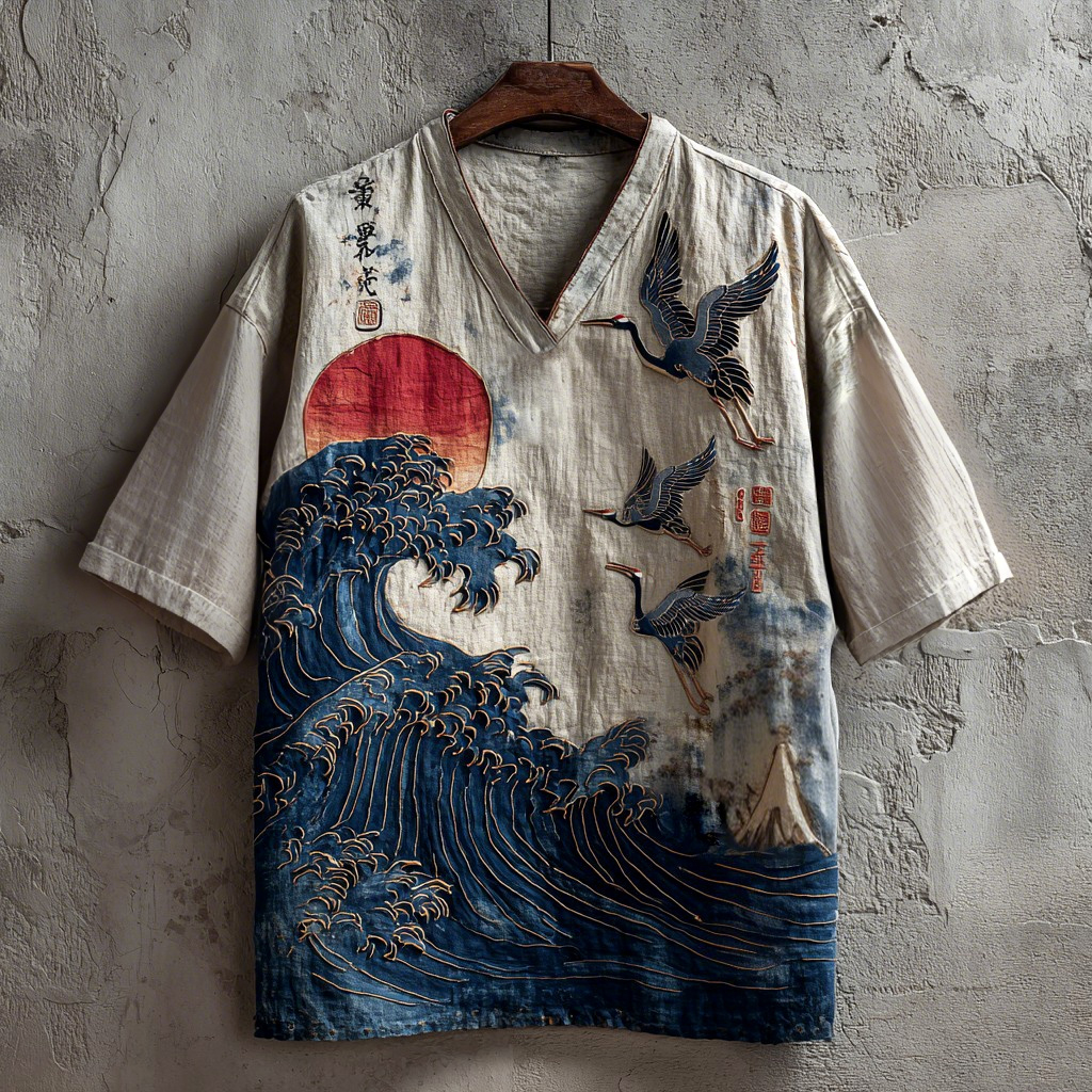 Japanese Pine And Waves Embroidered V-neck Linen Shirt