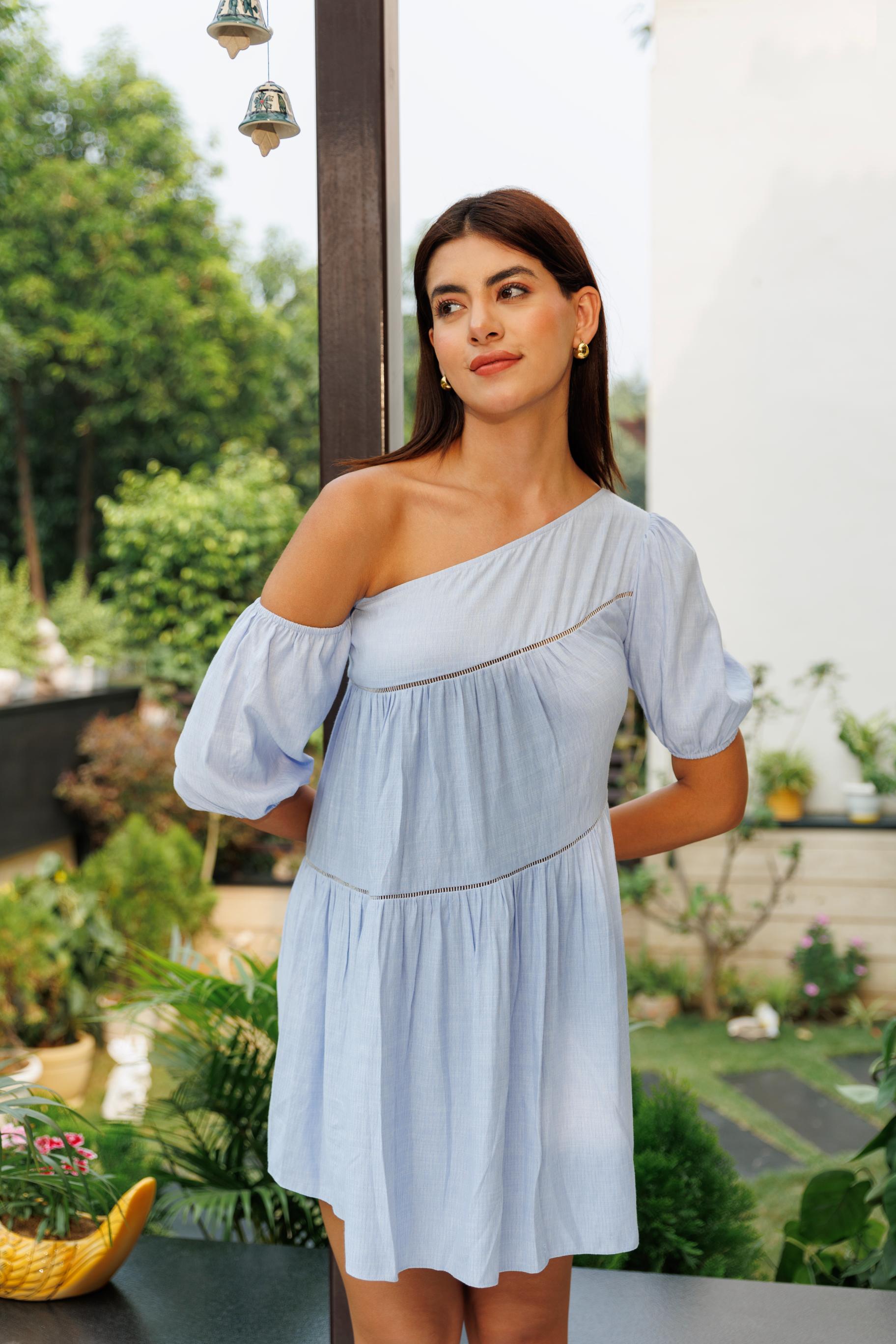 Take on your weekend the right way with this blue mini dress. Featuring a blue material with asymmetrical neckline, an off shoulder sleeve on right, and with lace detailing to add that extra chic vibe.