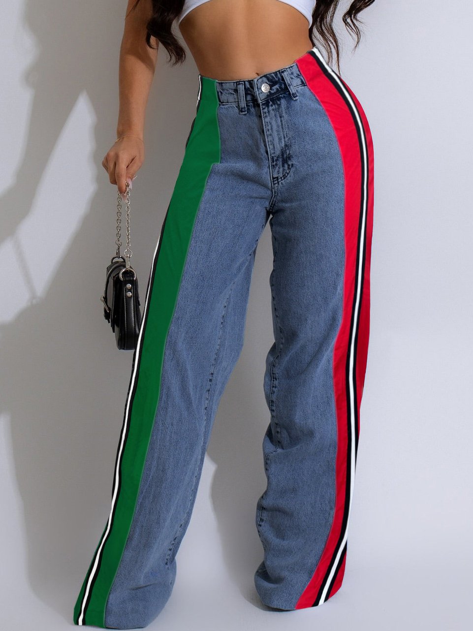 Women'S Casual Stretch Denim Splicing Three-Striped Wide-Leg Pants